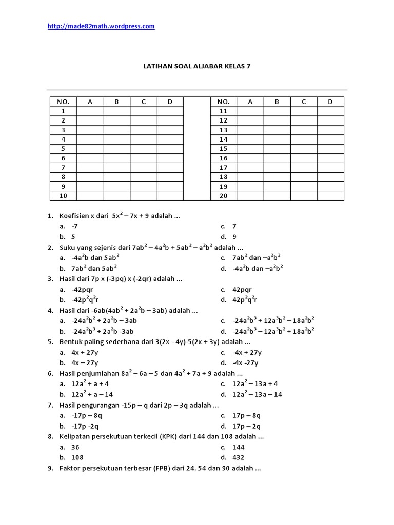 Komplit 25 Pola Soal Aljabar Kelas 7 Smp Dan Kunci Jawabnya Terbaru Raja Soal from i1.wp.com We did not find results for: Check spelling or type a new query. Soal bentuk aljabar kelas 7 kurikulum 2013 doc. Maybe you would like to learn more about one of these?