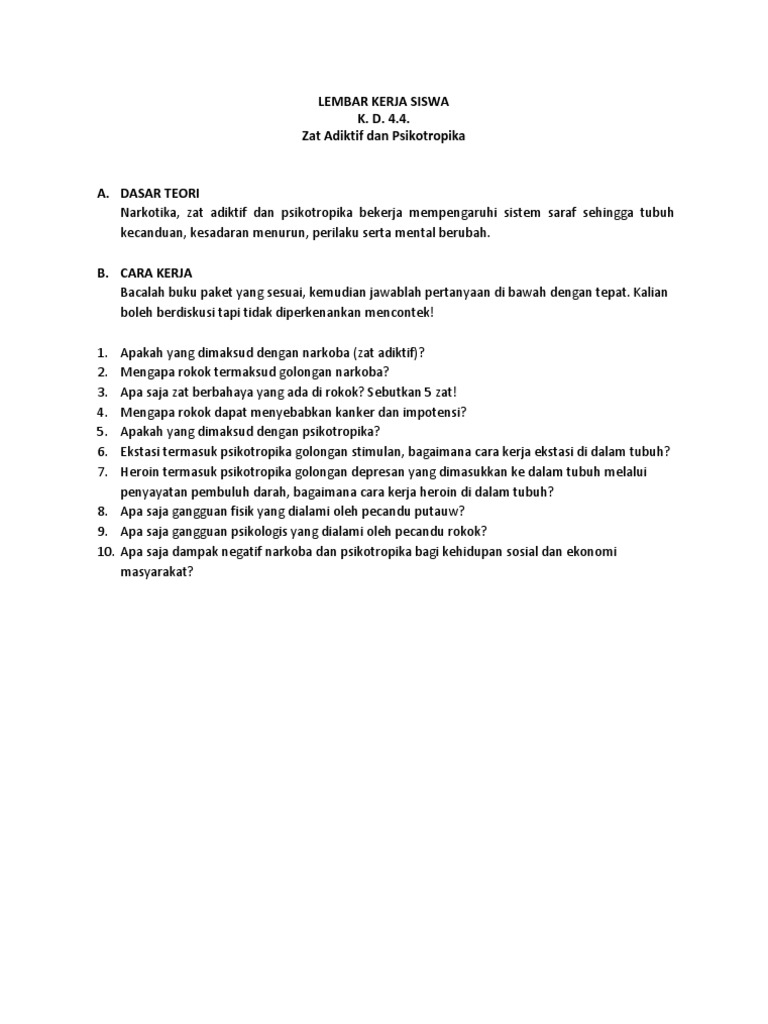 Jadi, sudah jelas bukan perbedaan zat adiktif dan zat aditif. Berikut ini yang merupakan contoh bahan aditif berupa pewarna buatan yang diijinkan adalah. Kali ini soalkimia.com akan membagikan contoh soal zat adiktif dan psikotropika beserta pembahasan dan jawaban. No 21 soal un 2012 kimia zat aditif contoh dan adiktif beserta jawabannya tekanan pada padat terbaru kumpulan pembahasan biologi kelas xi. Pilihlah satu jawaban yang tepat! Wanita akan lebih cepat mengalami mabuk saat mengkonsumsi. Latihan soal ini untuk membantu belajar peserta didik kelas 8 smp/mts dalam memahami materi zat adiktif dan psikotropika. Paket ii soal pengayaan ujian nasional mata nbsp indikator soal. Seorang pengguna narkoba memiliki gejala sebagai berikut. Sebaliknya, zat aditif buatan bila digunakan. Seperti salah satu contoh zat aditif dibawah ini. Contohnya adalah karet sintetis dan pecahan kaca. Latihan soal zat adiktif dan psikotropika.